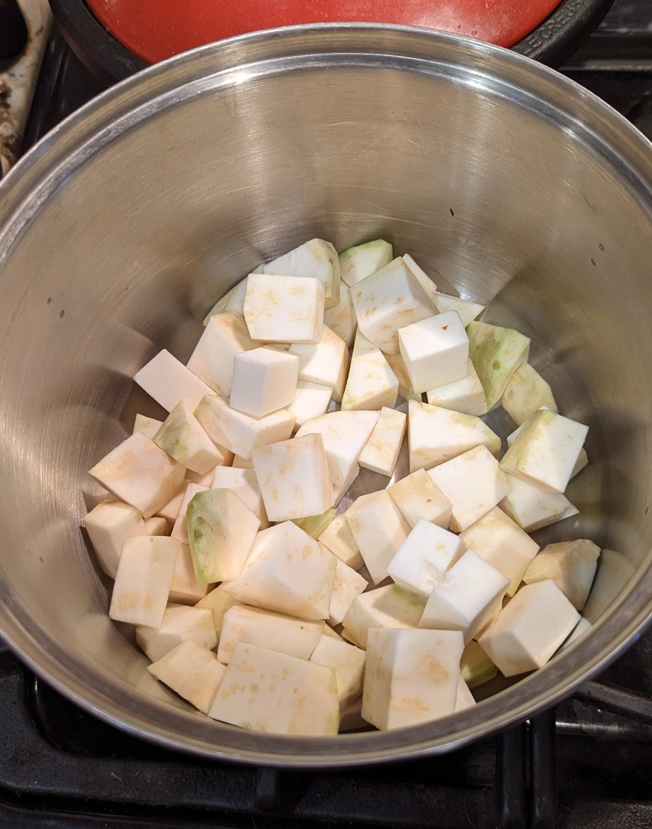 Next you will cut the celery root into chunks, I usually make them roughly 1”x1”. Place these in a pot and fill the pot with enough water to just cover the celery root.